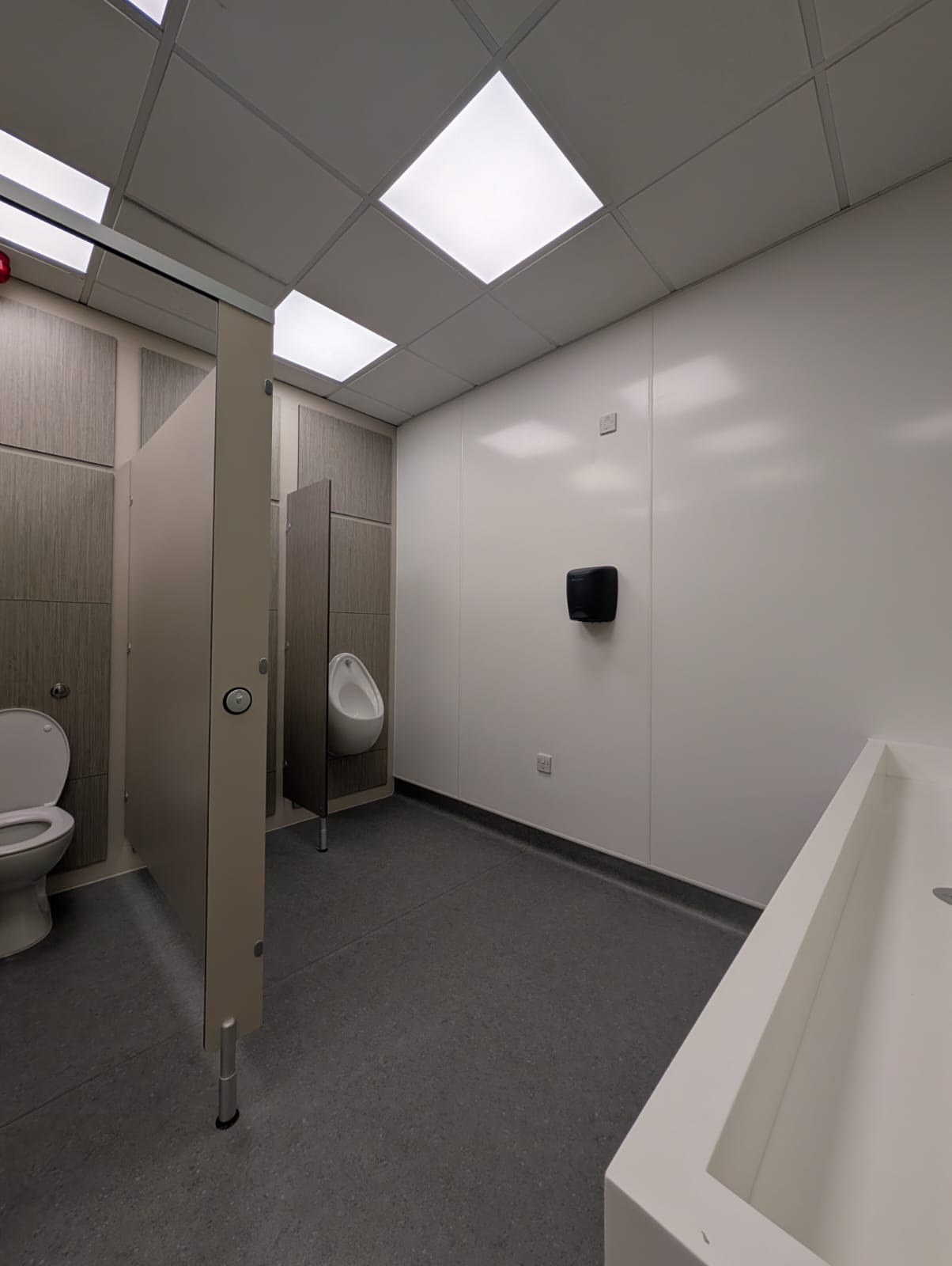 To maximise the available space, we converted the former ladies’ washroom into the new male facility, taking advantage of its larger footprint. The room was reconfigured 180 degrees, allowing for an additional toilet and two urinals, with new drainage and water feeds installed throughout. The new ladies’ washroom was fitted with three cubicles and a dedicated storage area for cleaning products.